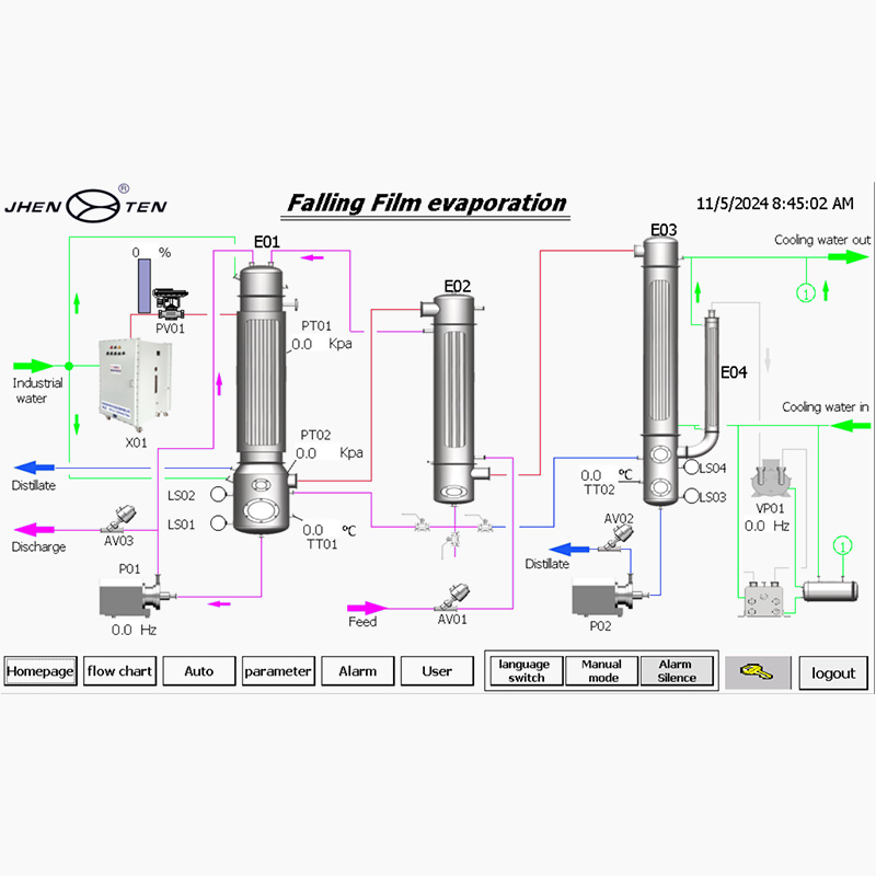 Equipado con terminal táctil industrial, incorpora plantillas de curvas de evaporación para modos continuo e intermitente, permitiendo el cambio de parámetros de proceso (temperatura, vacío, caudal de alimentación) con un solo toque. Cuenta con gestión de alarmas en tiempo real y autodiagnóstico de fallos, adaptándose a las necesidades de control preciso en condiciones operativas complejas de las industrias química y farmacéutica.
